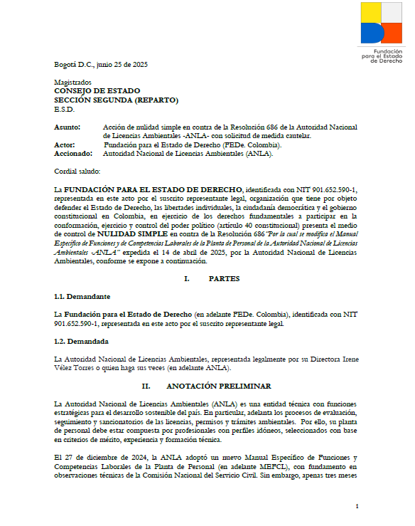 Una demanda contra cambios en el manual de funciones de la ANLA fue admitida por el Consejo de Estado. La acción fue presentada por la Fundación para el Estado de Derecho contra la Resolución 686 del 14 de abril de 2025, expedida por la Autoridad Nacional de Licencias Ambientales (ANLA). Esta resolución modificó el Manual Específico de Funciones y de Competencias Laborales de su planta de personal.