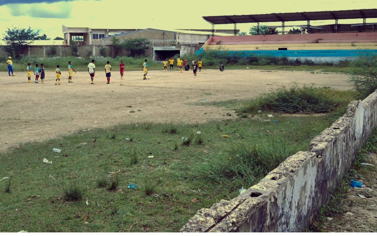 Las porterías han sido reemplazadas por llantas viejas que hacen las veces de arquerías, mientras que las graderías, deterioradas y sin mantenimiento, parecen más escombros que tribunas. En los bordes del campo, las zonas verdes crecen sin control y las estructuras de cemento están agrietadas y cubiertas de grafitis.