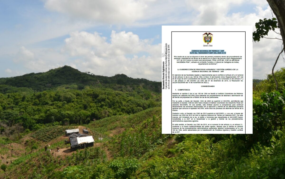 La denuncia ciudadana conocida por Infomilenials se produce luego de que la Agencia Nacional de Tierras profirió el Auto No. 202532000171409 del 15 de diciembre de 2025, mediante el cual dispuso formalmente el cierre del periodo probatorio dentro del procedimiento administrativo de deslinde o delimitación de tierras de la Nación sobre el predio rural denominado PÚA Lote No. 2 de la Antigua Hacienda Púa, ubicado en el Distrito de Cartagena de Indias.