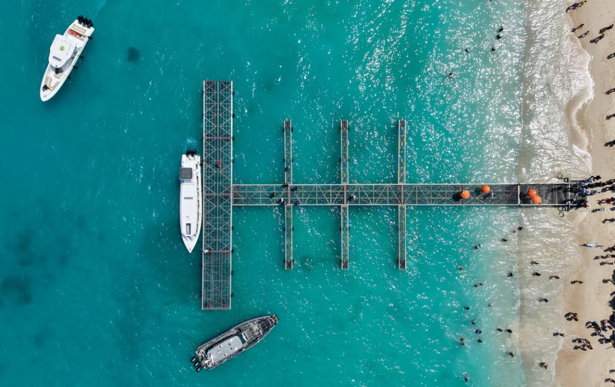 Vista aérea del muelle de los 300 metros de muelle tras su reactivación, con embarcaciones atracadas y flujo organizado de visitantes